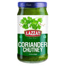 Glasburk med grön korianderchutney, etikett med korianderblad och texten 'Coriander Chutney'.
