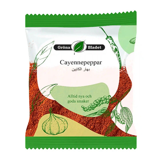 Gröna Bladet Cayennepeppar 40g – för dig som älskar när maten får lite extra bett. En liten mängd räcker långt – smakrik hetta på burk!