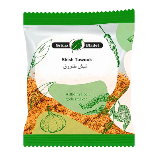 Upptäck smaken av Mellanöstern med Gröna Bladet Shish Tawouk 30g – den perfekta kryddblandningen för att skapa saftiga, grillade kycklingspett hemma!